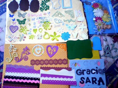 Hola amigas aqui compartiendo lo que recibí ayer de parte de Sara Blanco, Wow un montón de Die cuts muy bonitos y sobre todo útiles, pues Steff en facebok organizó un intercambio y nos dijo que eran 10 cortes y 5 flores hechas a mano pero mi amiga Sara en verdad que fue sumamente generosa y me envió muchos muchísimos cortes y abecedarios y justo con uno de ellos hice un letrerin improvisado GRACIAS SARA